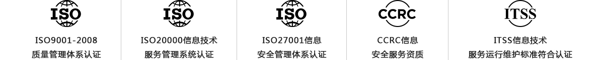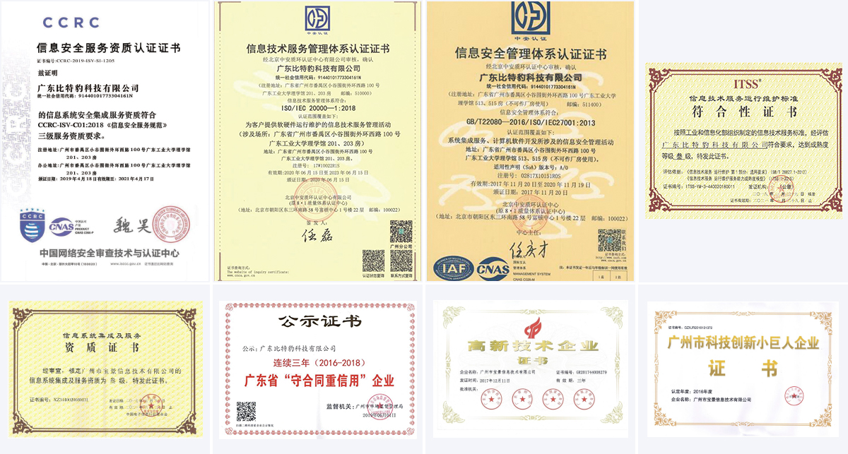 目前已經(jīng)通過ISO9001-2008質(zhì)量管理體系認(rèn)證、ISO20000信息技術(shù)服務(wù)管理系統(tǒng)認(rèn)證、ISO27001信息安全管理體系認(rèn)證、CCRC信息安全服務(wù)資質(zhì)、ITSS信息技術(shù)服務(wù)運行維護(hù)標(biāo)準(zhǔn)符合認(rèn)證,取得計算機(jī)信息系統(tǒng)集成及服務(wù)資質(zhì)三級認(rèn)證,被國家評為高新技術(shù)企業(yè)認(rèn)證。