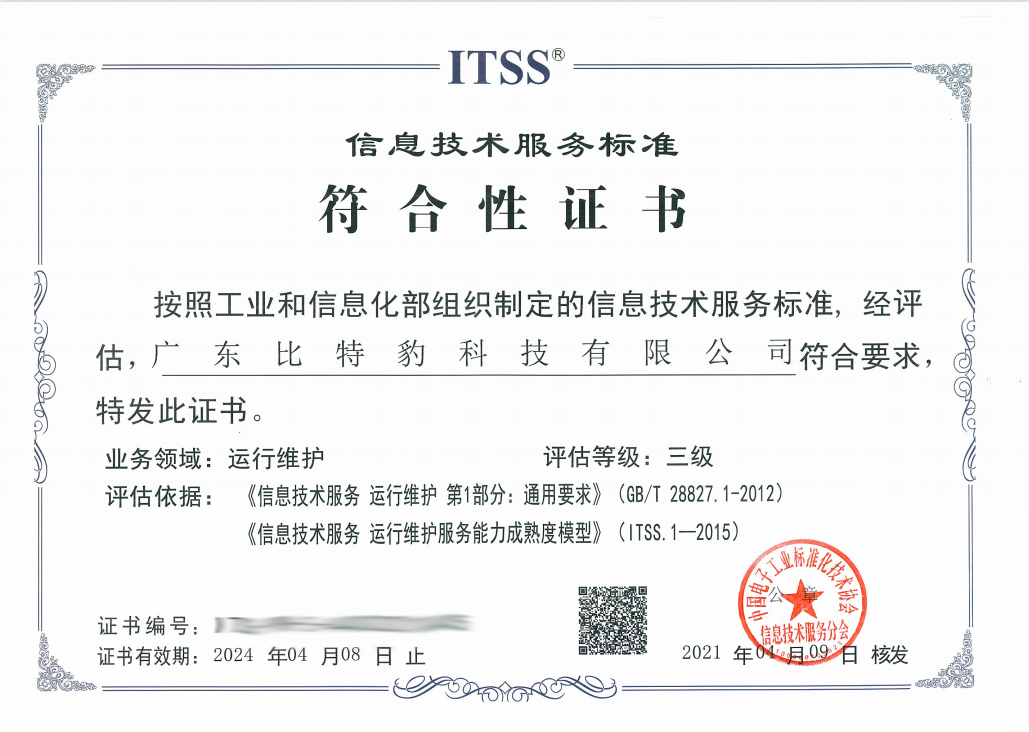 鼓掌??!比特豹正式通過工業(yè)和信息化部組織和制定的信息技術(shù)服務(wù)標(biāo)準(zhǔn)評估,順利獲得由中國電子工業(yè)標(biāo)準(zhǔn)化技術(shù)協(xié)會信息技術(shù)服務(wù)分會頒發(fā)的“信息技術(shù)服務(wù)標(biāo)準(zhǔn)符合性證書”?。?!