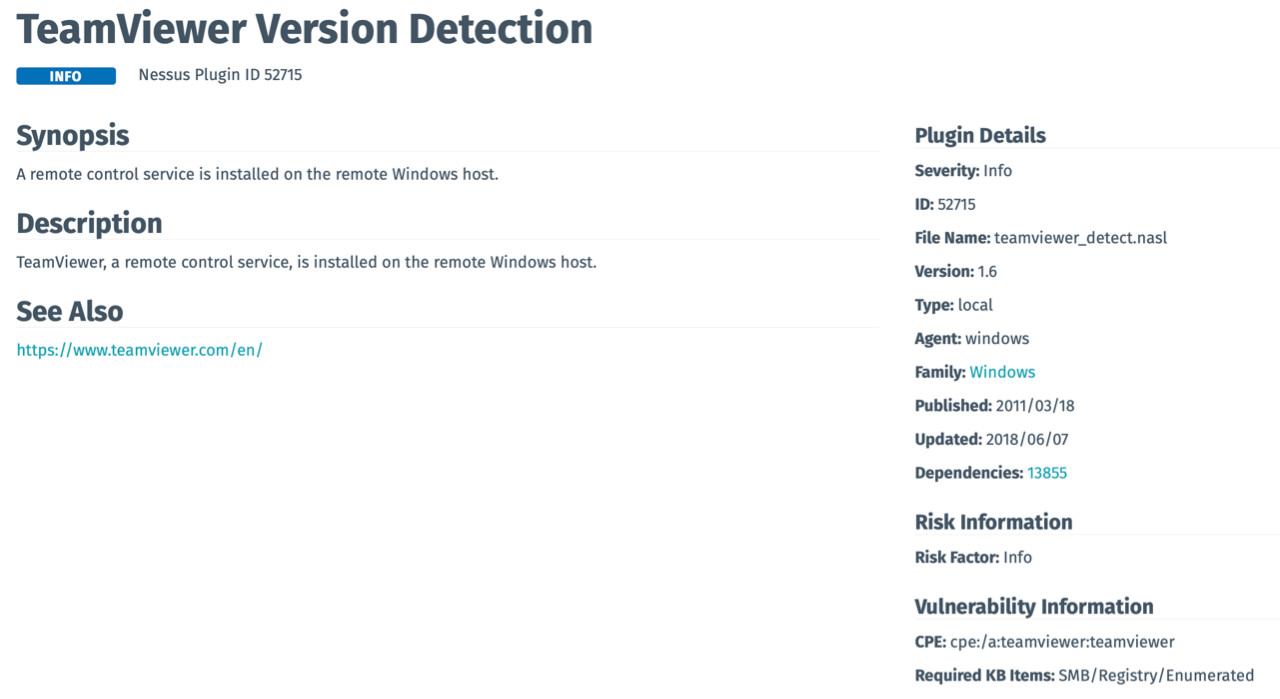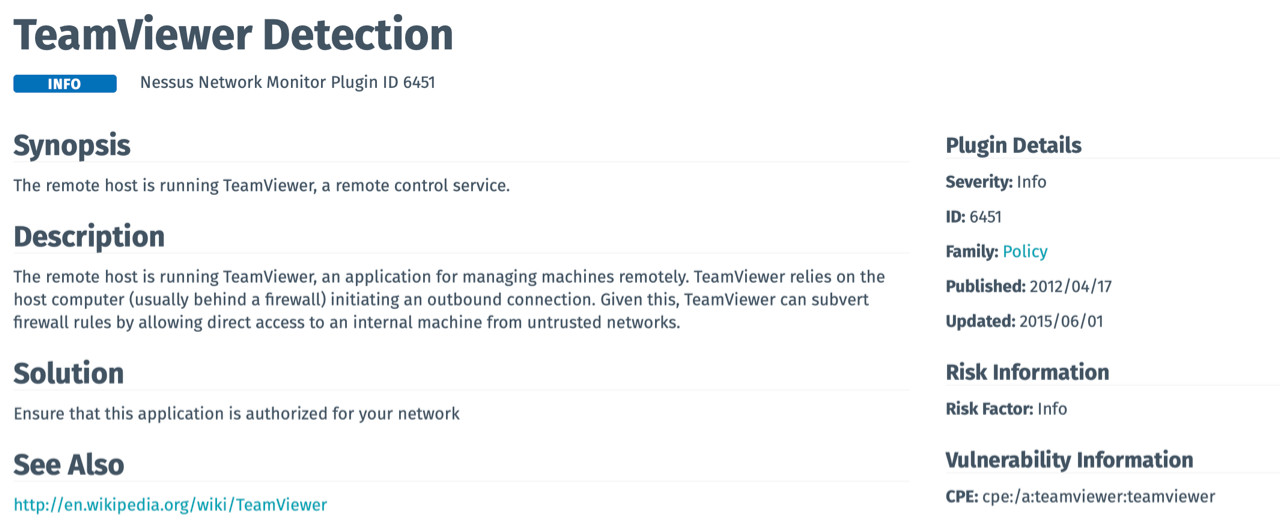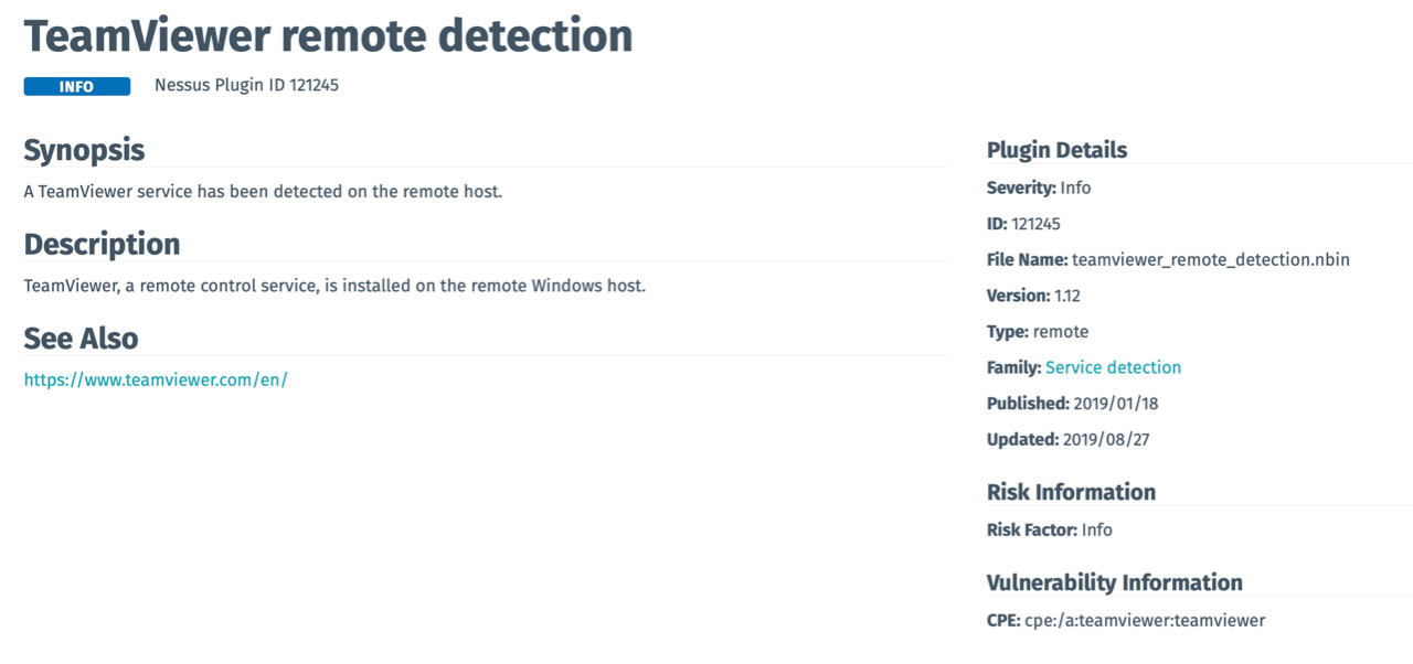 由于Teamviewer暫時還未提供安全公告且仍未有正式的CVE漏洞編號公布,Tenable暫時未推出針對此特定漏洞的檢查插件。但Tenable用戶仍然可以使用Tenable.SC主動遠程掃描插件和Tenable.CV平臺流量檢查插件分析全網(wǎng)所有安裝Teamviewer的資產(chǎn)信息。通過執(zhí)行TeamViewer資產(chǎn)探測掃描,分析出含有潛在風險的資產(chǎn),快速進行安全應(yīng)急和處置。Tenable可以也可以聯(lián)系相關(guān)Tenable本地技術(shù)支持團隊,獲取相應(yīng)的掃描策略和應(yīng)急服務(wù)。
