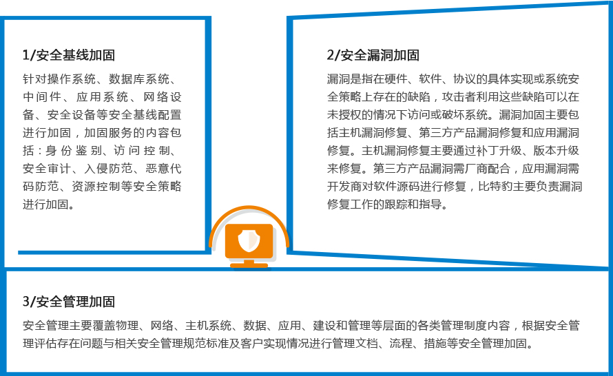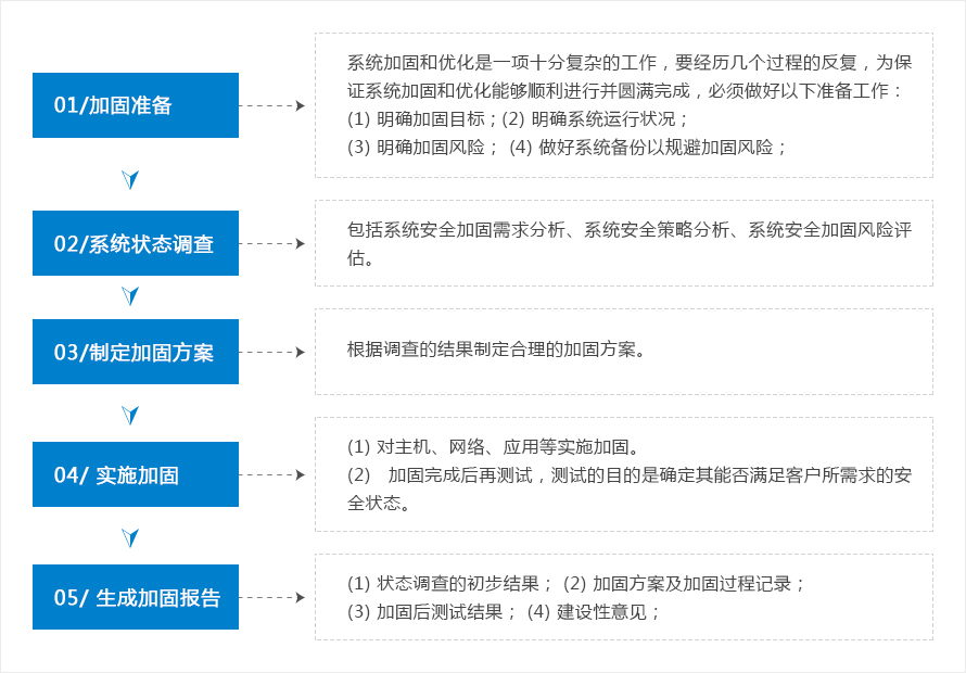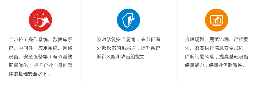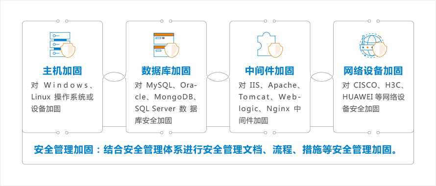 安全加固主要針對(duì)當(dāng)前信息系統(tǒng)存在安全漏洞、風(fēng)險(xiǎn)威脅和系統(tǒng)安全配置標(biāo)準(zhǔn)要求,并結(jié)合客戶實(shí)際情況,在客戶允許的前提下,對(duì)信息系統(tǒng)涉及的主機(jī)系統(tǒng)、網(wǎng)絡(luò)設(shè)備、應(yīng)用系統(tǒng)及數(shù)據(jù)庫進(jìn)行安全配置加固、安全漏洞加固和安全管理加固。