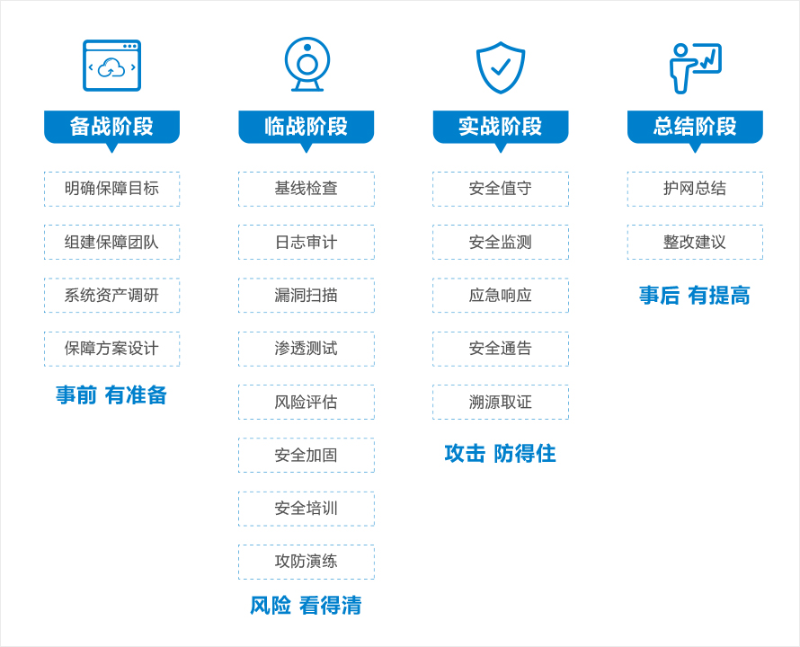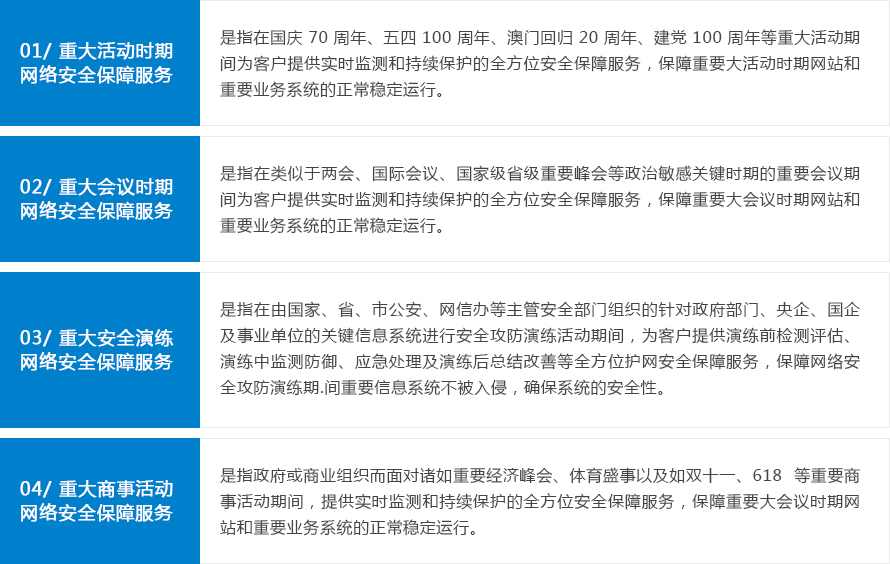 通過(guò)對(duì)國(guó)家重大活動(dòng)、重大會(huì)議、重大安全演練及重大商事活動(dòng)期期間,對(duì)單位重要信息系統(tǒng)提供網(wǎng)絡(luò)安全保障服務(wù),可幫助重保單位全面構(gòu)建重保時(shí)期的網(wǎng)絡(luò)安全積極防御體系、提升被保障單位風(fēng)險(xiǎn)威脅對(duì)抗能力。