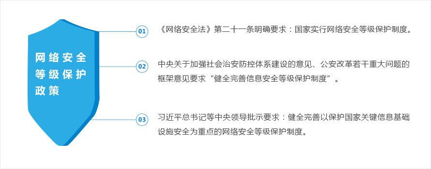 網(wǎng)絡安全等級保護是國家信息安全保障工作的基本制度、基本國策,是國家對基礎信息網(wǎng)絡和重要信息系統(tǒng)實施重點保護的關鍵措施。國家對網(wǎng)絡安全等級保護作出了相應政策及法律要求: