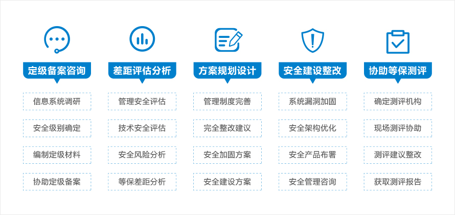 依據(jù)《信息系統(tǒng)安全等級保護定級指南》,通過客戶定級保護的信息系統(tǒng)進行調(diào)研,確定信息系統(tǒng)的安全保護等級,編制定級備案表和定級報告,協(xié)助用戶單位向所在地區(qū)的公安機關辦理備案手續(xù)。 |